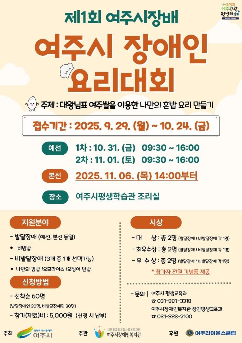 여주시 관계자는 “이번 대회는 장애인들이 여주쌀을 활용하여 자신만의 요리를 만드는 과정 속에서 성취감을 얻고 지역 농산물의 가치를 함께 공유할 수 있는 뜻깊은 시간이 될 것”이라며, “앞으로도 장애인의 평생학습 확대와 지역사회 통합을 위한 다양한 기회를 마련하겠다”고 말했다.