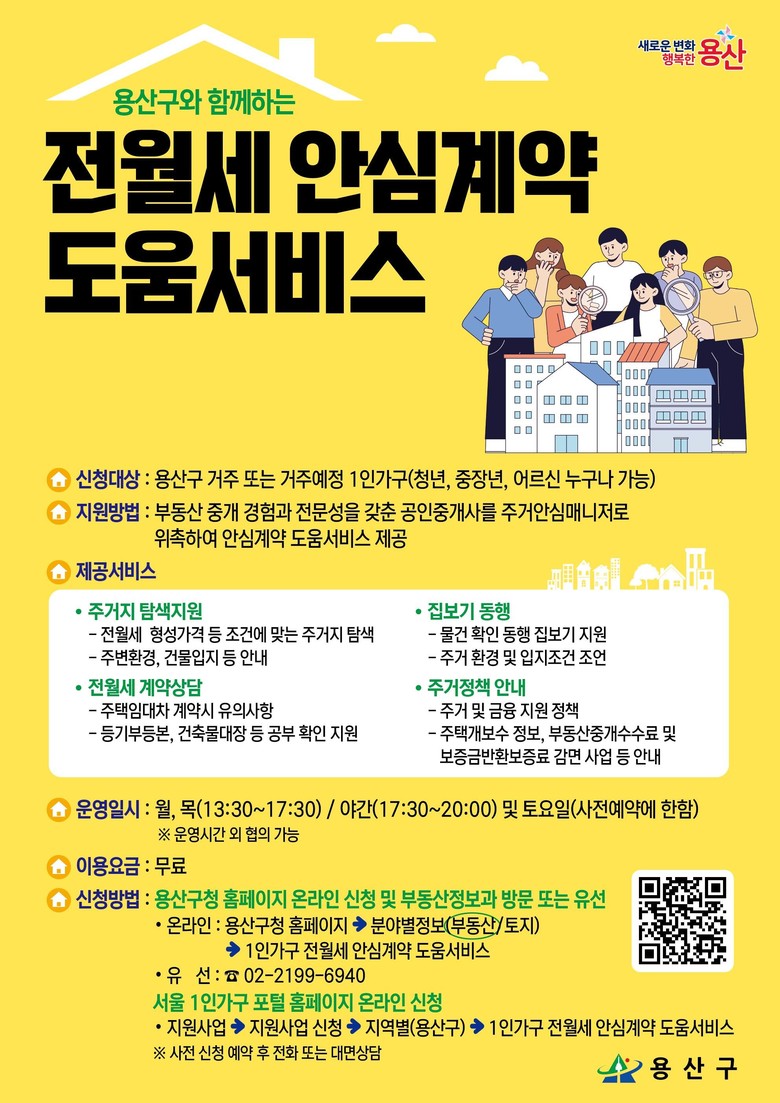 경험 많은 개업공인중개사를 ‘주거안심매니저’로 위촉해 ▲전·월세 계약 상담 ▲주거지 탐색 ▲집 보기 동행 ▲주거 지원 정책 안내 등을 지원한다. 이를 통해 1인 가구 등 정보 취약계층의 전사사기 및 중개 관련 사고 예방에 도움이 될 것으로 기대된다. 신청은 ‘서울 1인가구포털’(씽글벙글서울) 또는 용산구청 부동산정보과 방문‧전화(☎ 02-2199-6940)로 가능하다.