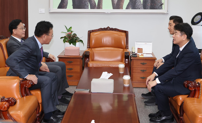 더불어민주당 김병기 원내대표와 문진석 원내운영수석부대표, 국민의힘 송언석 원내대표와 유상범 원내운영수석부대표가 18일 서울 여의도 국회에서 회동하고 있다. 2025.11.18