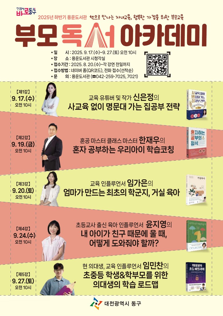 박희조 동구청장은 “부모 독서 아카데미는 학부모의 자녀교육 역량을 높이는 유익한 기회”라며 “많은 주민들이 함께 참여해 자녀 교육의 방향을 고민하고 성장의 계기를 마련하시길 바란다”고 말했다.