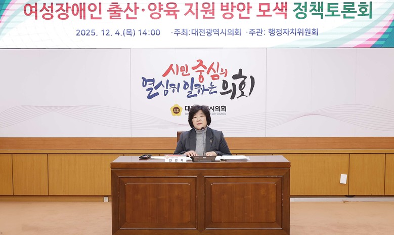 [대전 세계타임즈=이채봉 기자] 대전시의회 행정자치위원회는 4일 시의회 3층 소통실에서 안경자 의원(국민의힘, 비례대표) 주재로 「여성장애인 출산·양육 지원 방안 모색 정책토론회」를 개최했다.