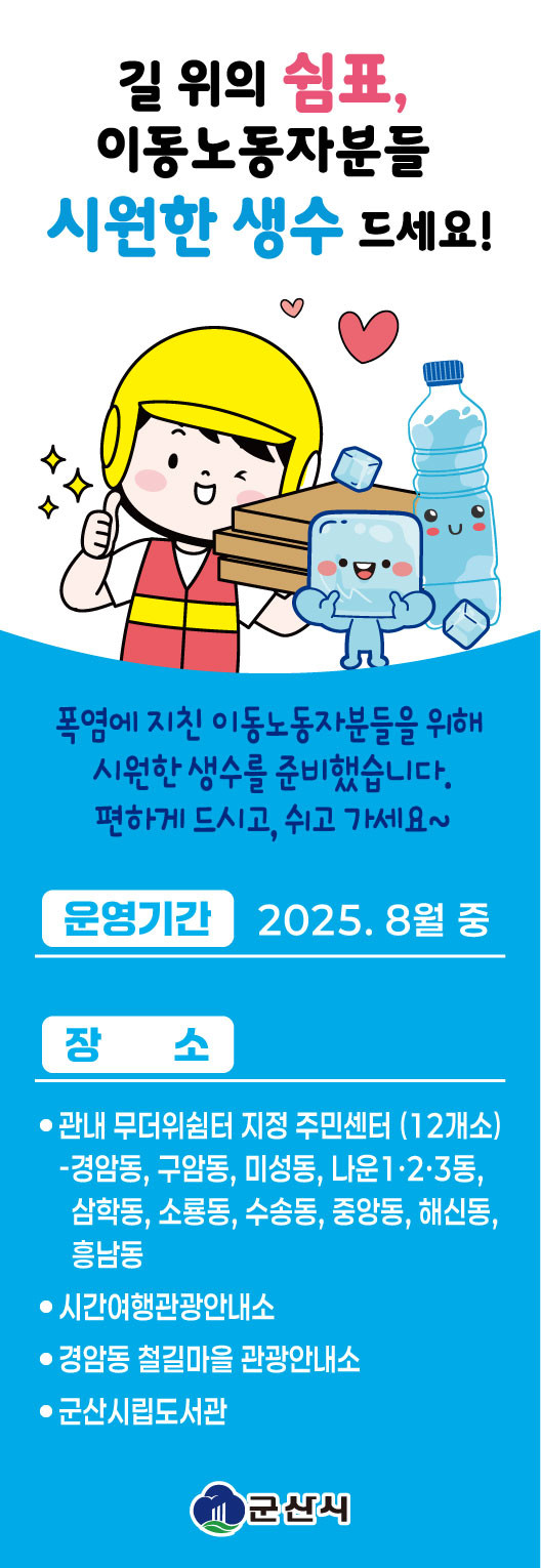 이헌현 군산시 일자리경제과장은 “이동노동자는 업무 특성상 정해진 휴게시설이 없어 냉음료를 확보하기 어려운 경우가 많다”며, “무더위 속 시원한 생수 한 병이 큰 위로가 될 수 있기를 바란다”고 전했다.