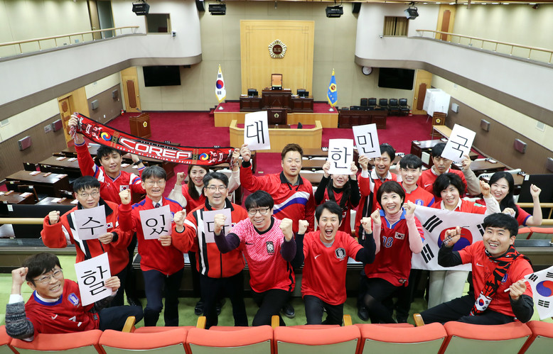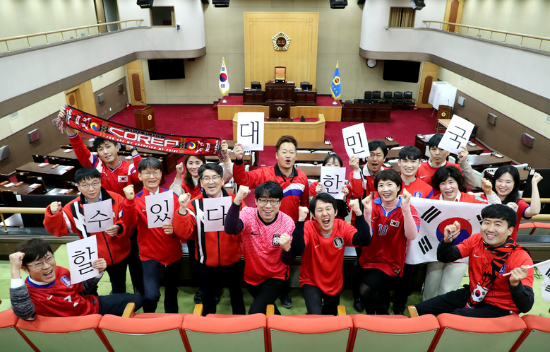 [충북 세계타임즈=이현진 기자] 대한민국 축구 국가대표팀이 12년 만에 월드컵 16강에 진출한 가운데 5일 충북도의회 사무처 직원들이 브라질 전을 앞둔 선수들의 승리를 기원하는 함성을 외치고 있다. / 충북도의회 제공