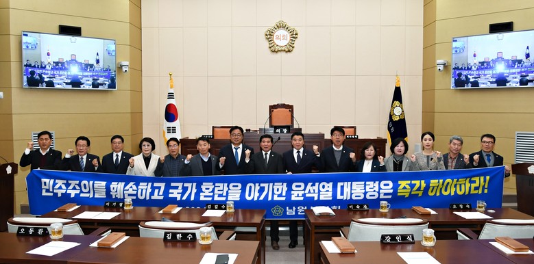 이를 통해 남원시의회는 ▲윤석열 대통령은 헌정질서의 불법적 파괴행위에 책임을 지고 대통령직에서 하야할 것 ▲국회와 수사기관은 이번 사태를 철저히 조사하고 불법행위에 가담한 책임자들을 반드시 처벌할 것 ▲국회와 정부는 이번 사태로 인해 초래되고 있는 국가 경제와 민생 불안에 대하여 신속하게 대책을 마련할 것을 강력하게 촉구했다.
