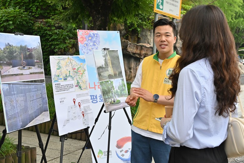 | ▲ 21일 보라매공원 인근에서 열린 ‘나라 사랑 평화 나눔 캠페인’이 열린 가운데 한 시민이 동작구 현충 시설 소개를 경청하고 있다. [사진 제공 = 신천지자원봉사단 동작지부] |