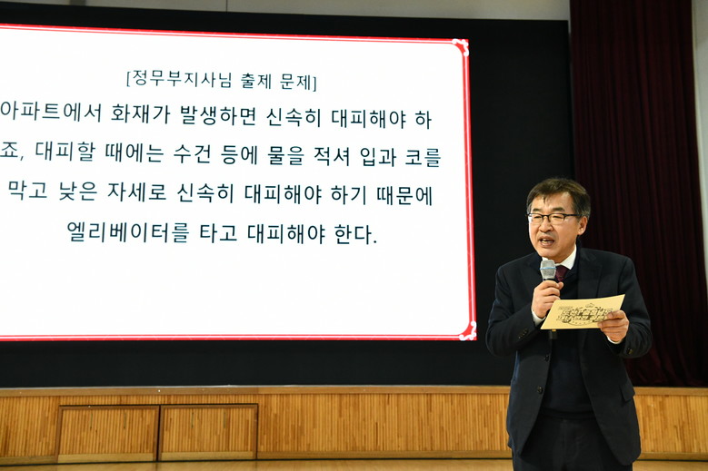 퀴즈 문제는 평소 학교 교육과 체험 활동을 통해 배운 재난 대응 지식과 안전사고 예방, 응급 대처, 화재·지진 대응 등 실생활에 꼭 필요한 내용을 중심으로 출제해 교육적 효과를 높였다.