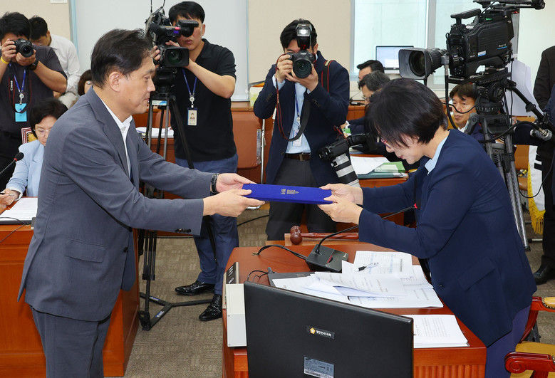 방송통신위원회 김태규 부위원장이 14일 오전 국회에서 열린 과학기술정보방송통신위원회의 '불법적 방송문화진흥회 이사 선임 등 방송장악 관련' 2차 청문회에서 더불어민주당 소속 최민희 위원장에게 선서문을 전달하고 있다. 2024.8.14