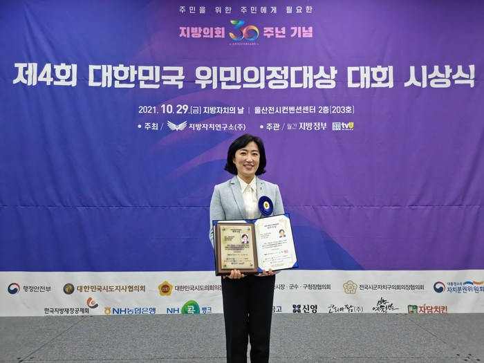 이번 제4회 대한민국 위민의정대상에는 총 270명의 광역 및 기초의원이 응모하여 1·2차 서면.대면심사와 현지실사를 거쳐 총 36명이 시상자로 결정되었으며, 광주광역시의회 신수정 의원이 최우수상의 영예를 안았다.
