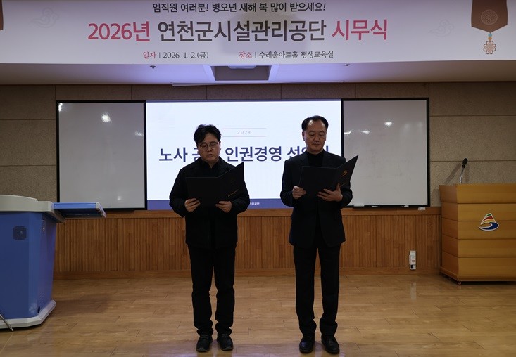 연천군시설관리공단 이사장은 “2026년 새해 업무를 인권경영 선언과 함께 시작하게 되어 뜻깊다”며, “앞으로도 노사가 협력하여 서로 존중하는 건강한 조직문화를 만들고, 지역사회와 동반 성장하는 인권 친화적 공기업이 되도록 최선을 다하겠다”고 밝혔다.