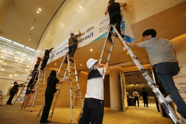 [세계타임즈 = 백진욱 기자] 9월 17일 오후 HWPL 봉사자들이 9.18 평화만국회의 9주년 기념식 행사가 열릴 호텔에서 현수막 설치를 하고 있다.