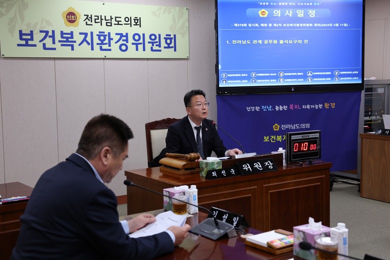 [전남 세계타임즈=우덕현 기자] 전라남도의회 보건복지환경위원회는(위원장 최선국) 4월 11일 상임위 회의실에서 폐회 중 원포인트 회의를 열고 전라남도 국립의과대학 유치와 관련한 긴급 현안 질문을 위해 ‘관계 공무원 출석요구의 건’을 의결했다.