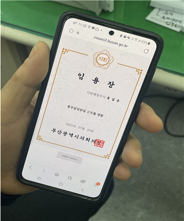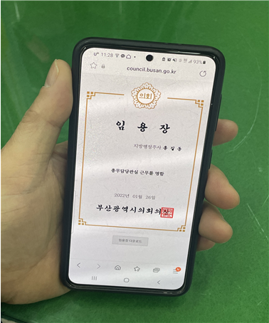 신상해 의장은 'OOO 주무관님. 부산광역시의회에서 함께 일할 수 있게 된 것을 축하하고 환영합니다. 지방의회 발전에 기여해 주시길 바랍니다'라는 내용의 축하 메시지와 함께 모바일 임용장을 전달했다.