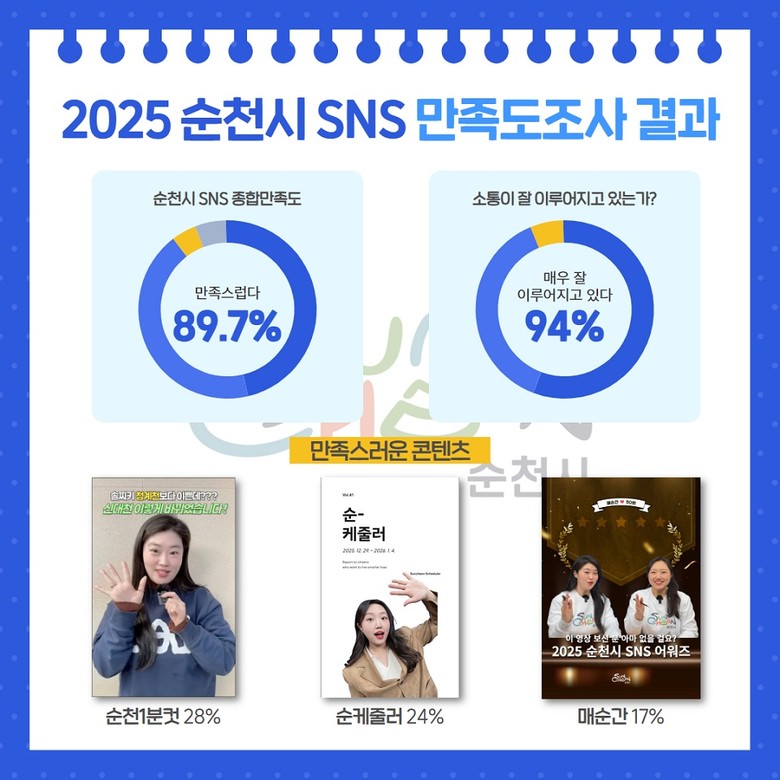 가장 선호하는 콘텐츠로는 짧고 쉬운 영상으로 시정을 알리는‘순천1분컷’(28%)이 1위를 차지했으며, 시정 주요 일정을 한눈에 보여주는‘순케줄러’(24%)가 뒤를 이었다. 이용자들은 “타 지자체보다 트렌디하고 실생활에 유익한 영상이 많아 유용하다”는 의견을 남기기도 했다.