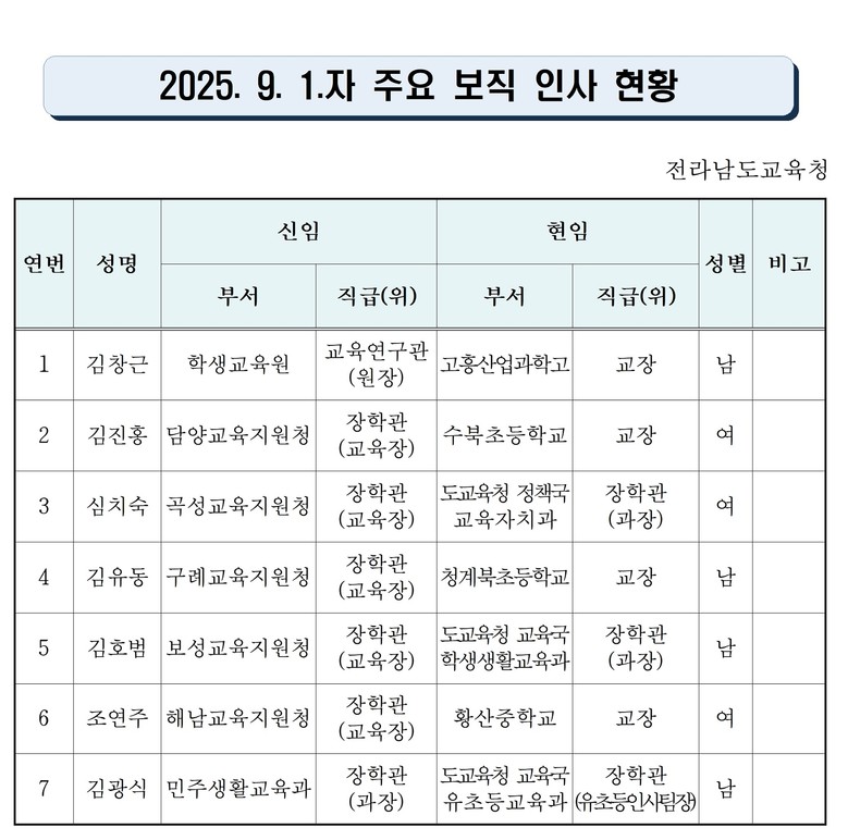 ※ 붙임 전라남도교육청 2025. 9. 1.자 주요보직 임용자 현황