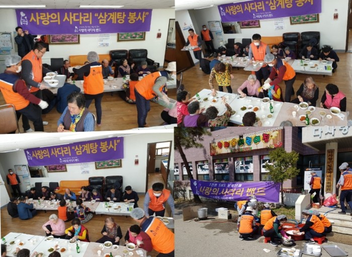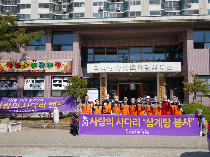 [대전=세계타임즈 이장성 기자] 다양한 봉사를 꾸준히하고 있는 SNS 대전시 봉사단체 (사)사랑의 사다리 밴드(리더 이정제)는 4일 오전11시, 대덕구 목상동에 위치한 다사랑아파트 경로당(회장 박순임)에서 ㈜동건운수(대표 이선엽)와 함께 삼계탕 100그릇 봉사로 사회적 효행을 실천하였다.
