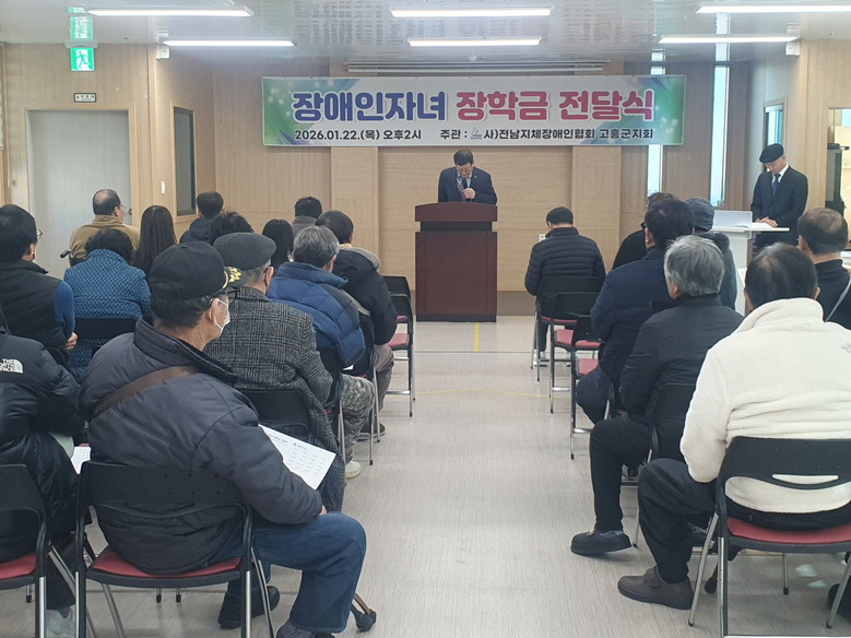 [전남 세계타임즈=우덕현 기자] 전남지체장애인협회 고흥군지회(지회장 유종옥)는 지난 22일 고흥군장애인복지관 강당에서 장애인 가정 학생들을 위한 장학금 전달식을 개최했다.