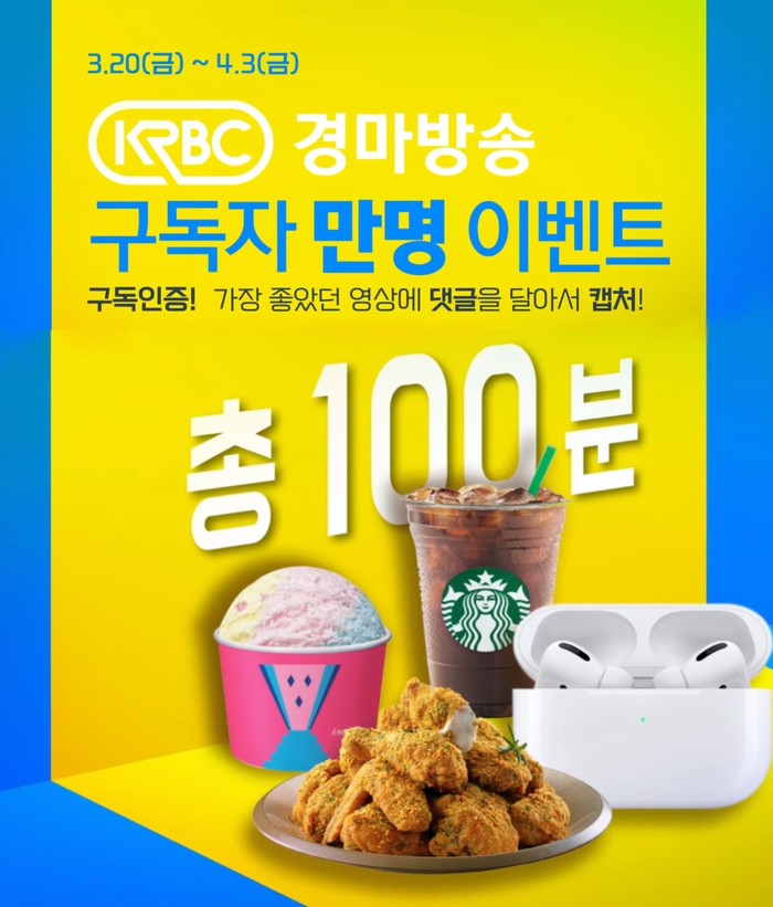2017년 개설된 한국마사회의 '경마방송 KRBC' 채널은 경주 영상, 기수·조교사 인터뷰 등 경마에 대한 다양한 콘텐츠를 제공하여 경마 고객에게 큰 인기를 얻고 있다. 경마팬들의 뜨거운 호응에 힘입어 구독자 만 명을 돌파, 이에 감사이벤트를 시행한다. 무선이어폰 2명을 포함해 치킨 세트 20명, 파인트 아이스크림 쿠폰 28명, 커피전문점 아메리카노 쿠폰 50명 등 총 100명에게 다양한 상품을 제공한다.