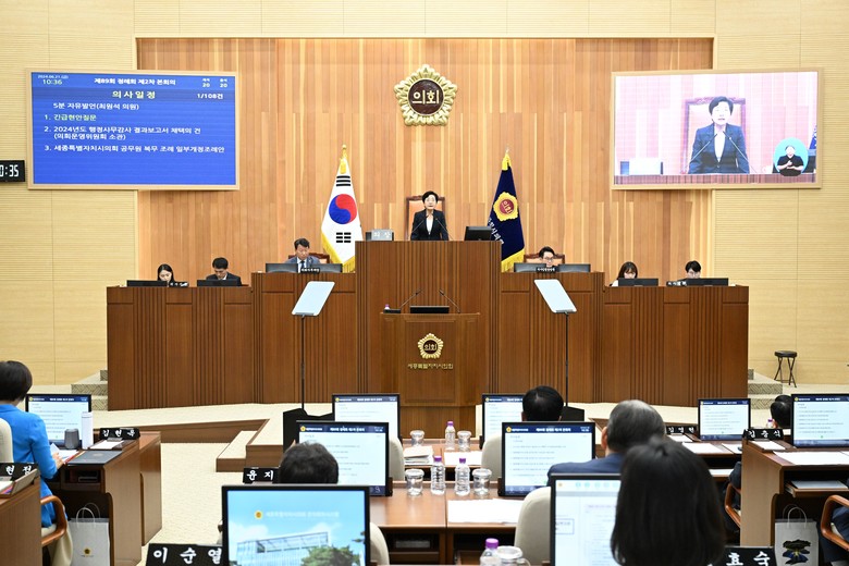또한, ‘2023회계연도 세종특별자치시 세입·세출 결산 승인의 건’, ‘2024년도 제1회 세종특별자치시교육비특별회계 세입·세출 추가경정예산안’ 등 예산결산특별위원회 소관 8건도 의결됐다.