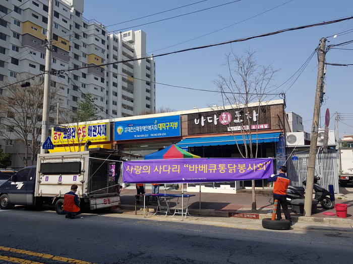 [대전=세계타임즈 이장성 기자] 대전광역시 봉사 단체 사랑의 사다리 밴드(리더 이정제)는 2일 오전10시~오후 3시, 대전신체장애인복지회 대덕구지부(지부장 정구찬)에서 바비큐 통닭 120마리 봉사로 유리 사회의 따뜻한 정을 전달하였다.