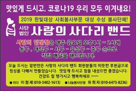 대전시지체장애인협회 동구지회 김연숙 회장은 “매월1회 사랑의 사다리 밴드 봉사단체에서 맛있는 밑반찬을 6년째 지원해 주어서 큰 힘과 위안이 된다.”면서 감사함을 전했다.