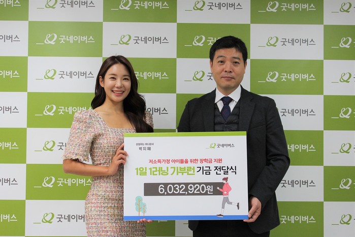 박지혜 아나운서는 개인 SNS채널을 통해서 팔로워들과 함께 크라우드펀딩 '1일 1러닝 기부런' 이벤트를 기획하고 10월 14일부터 27일까지 약 2주간 진행했다. 참여자들은 1km 당 1,000원 ~ 10,000원 금액을 약정한 뒤 실제 러닝 한 거리만큼 기부에 참여했고 약 2주 동안 112명이 참여하여 총 771만 2,920원이 모금되었으며, 그 중 603만 2,920원을 굿네이버스 서울본부에 전달했다. 굿네이버스 서울본부가 전달받은 후원금은 서울지역 내 초·중·고등학교에 다니는 저소득가정 아동을 위한 장학금으로 사용될 계획이다.