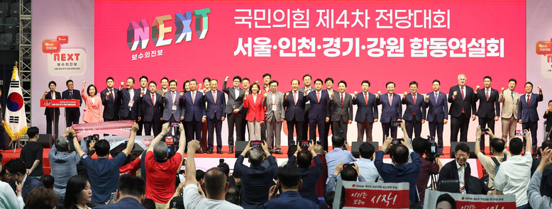 국민의힘 당 대표·최고위원 후보들이 17일 오후 경기 고양시 고양 소노 아레나에서 열린 제4차 전당대회, 서울 인천 경기 강원 합동연설회에서 손을 들고 파이팅하고 있다.[사진=연합뉴스]