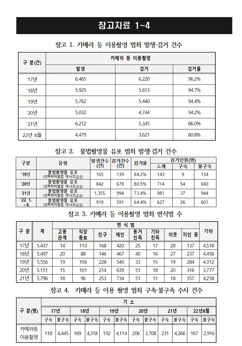 몰카 촬영물 유포에 해당하는 불법촬영물 유포 범죄는 2021년 1,355건이 발생했으나, 검거율은 2021년 73.4%, 2022년 8월 기준 64.4%에 그쳤다.