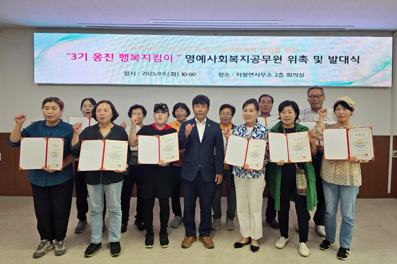 이날 행사에는 이장, 노인맞춤돌봄 생활지원사 등 21명이 명예 사회복지 공무원으로 위촉되어, 지역 내 취약계층 안부 확인, 복지제도 안내 및 서비스 연계 지원 등 다양한 복지 역할을 수행하게 되며, 일상 속에서 복지 위기가구를 발굴하고 신속하게 행정에 전달하는 ‘생활 속 인적 안정만’으로서의 기능을 담당하게 된다.