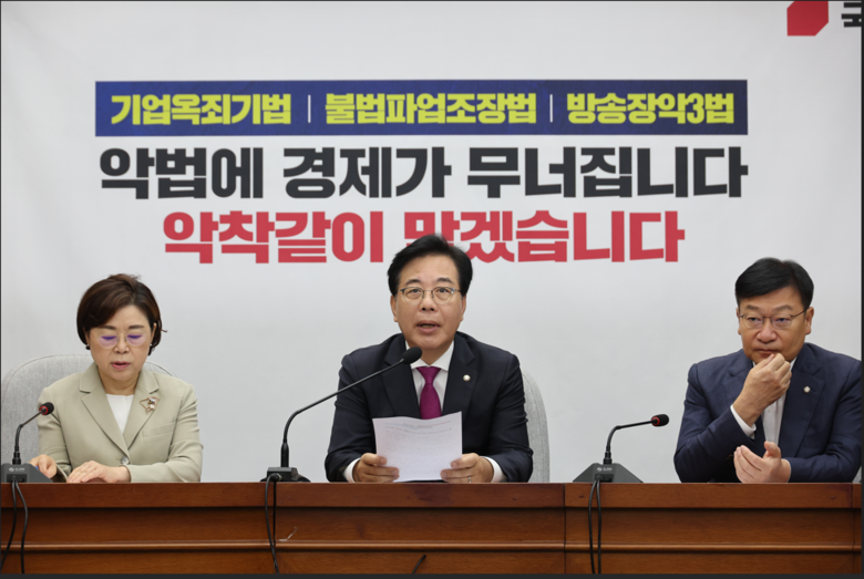 송 비대위원장은 "기업을 옥죄는 입법 강행은 있어선 안 된다"면서 "이재명 정부와 더불어민주당의 세금 폭탄으로부터 대한민국 주식시장과 경제를 지켜내기 위해 모든 노력을 다할 것"이라고 밝혔다. 김정재 정책위의장은 민주당을 향해 "양당 교섭단체간 세제개편 합의 기구를 구성해 세수 안정, 투자 촉진, 시장 신뢰 회복을 논의할 합리적인 틀을 마련하자"며 "정부 독주가 아니라 국회 숙의와 국민 합의가 전제돼야 함을 명심하기 바란다"고 말했다.