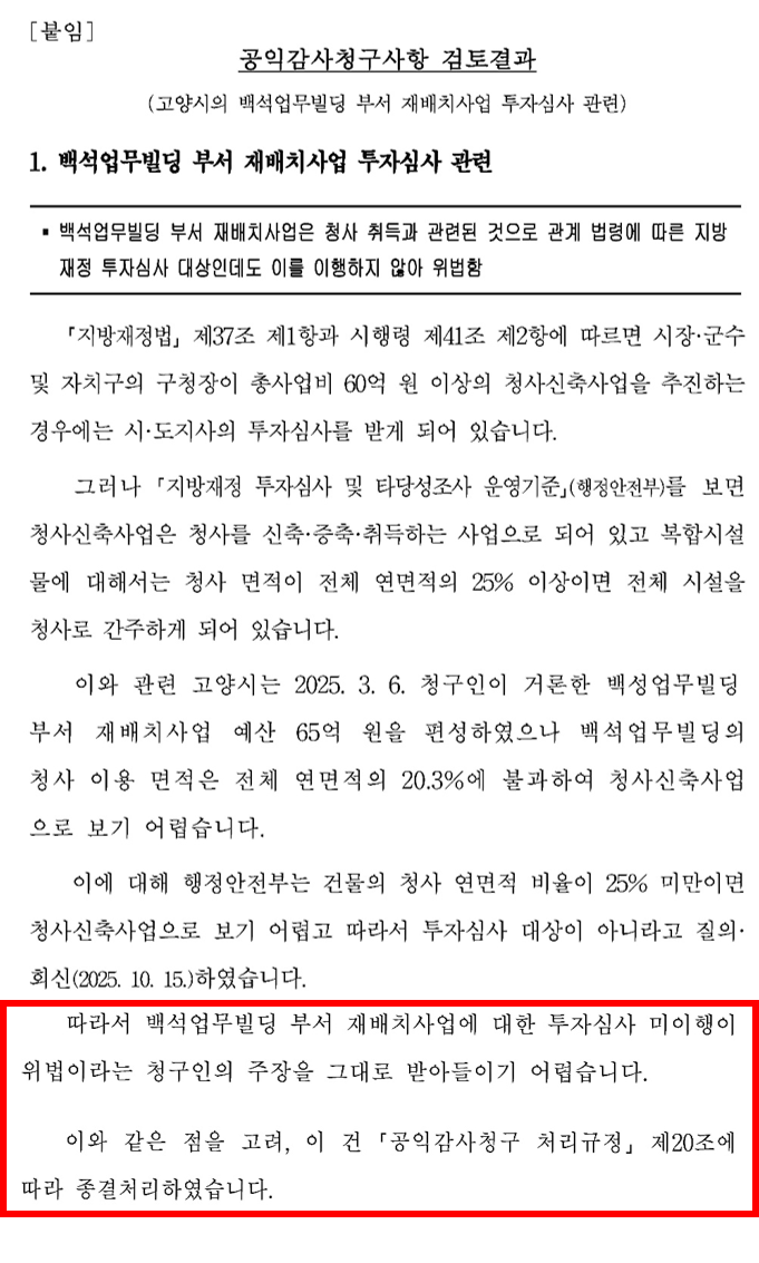 이어, "그러나 최근 감사원은 ‘지방재정 투자심사 운영 기준’에 따라, 본 사업의 청사 이용 면적이 복합시설의 청사 간주 기준 25%에 미달하여 법적으로 ‘투자심사 대상이 아니다’라고 명확히 결론 내렸다”며, "이는 집행부 정책이 합리적 기준을 준수했음을 입증한 것”이라고 강조했다. (자료 참조)