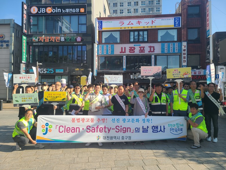 이번 캠페인은 중구 건축과 광고물팀 주관으로 옥외광고협회, 중부경찰서 범죄예방대응과, 은행·대흥동 상점가 상인 등 민·관·경이 합동으로 참여해 불법광고물 정비와 계도·단속활동을 실시하였으며, 노후· 위험 간판 등 광고물 안전 점검도 병행하였다.