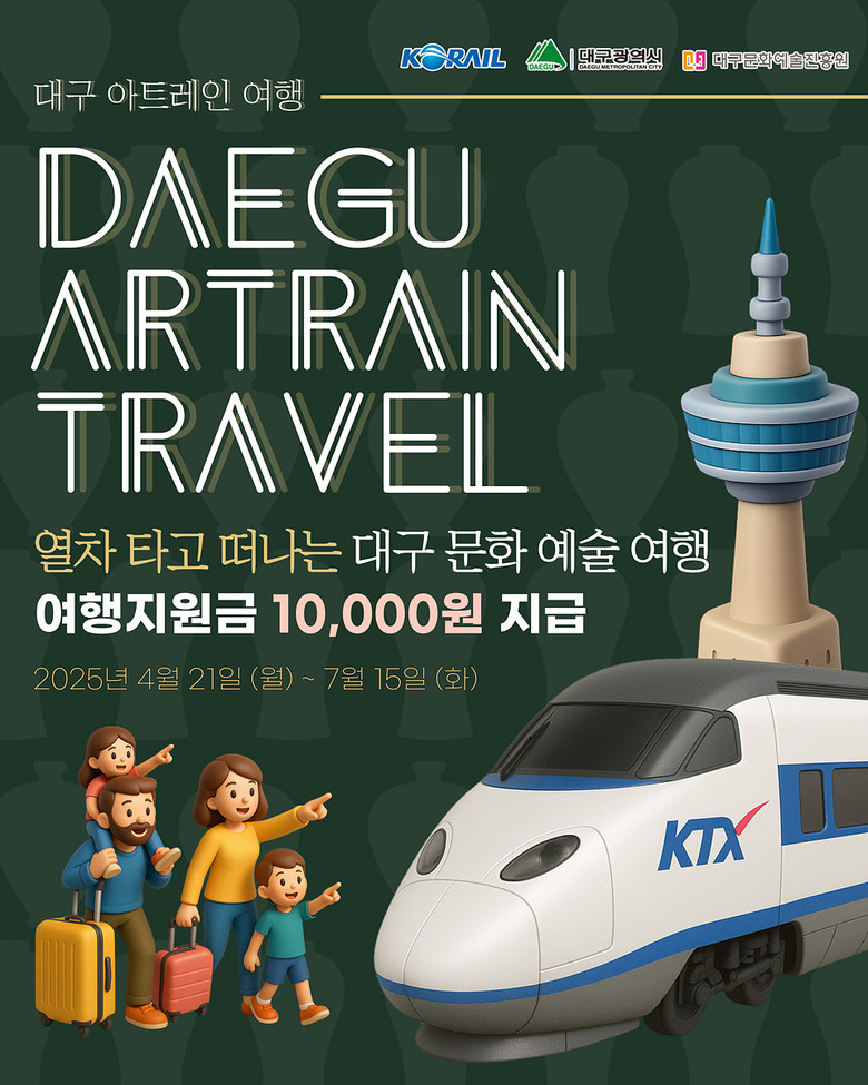 ‘대구 아트레인 여행’은 국내관광이 본격적으로 시작되는 4월부터 7월까지 신규 관광지를 찾아 여행을 떠나는 가족, 친구, 연인들을 대상으로 기차여행과 함께 대구의 문화예술을 즐기며, 여행지원금도 지원받는 기분 좋은 여행이 되길 바라며 기획되었다.