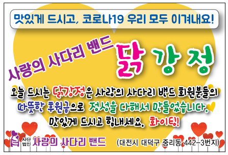 대전장애인주간보호시설협회 유근선 회장은 “오늘 사랑의 사다리 밴드 봉사단체에서 맛있는 닭강정을 지원해 주어서 큰 힘과 위안이 된다.”면서 감사함을 전했다.