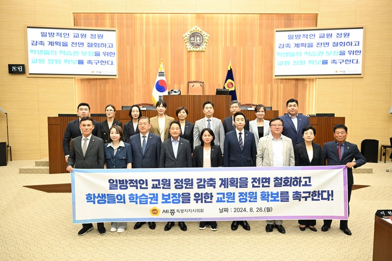끝으로 세종시의회는 정부의 일방적인 교원 정원 감축 계획을 즉시 철회할 것을 강조하며 ▲지역의 교육여건에 맞는 중장기적인 교원 수급 대책 마련 ▲학급당 학생 수 20명 상한선 법제화 ▲「세종시법」의 ‘정원 외 교원임용 특례안’ 수용을 강력히 촉구했다.