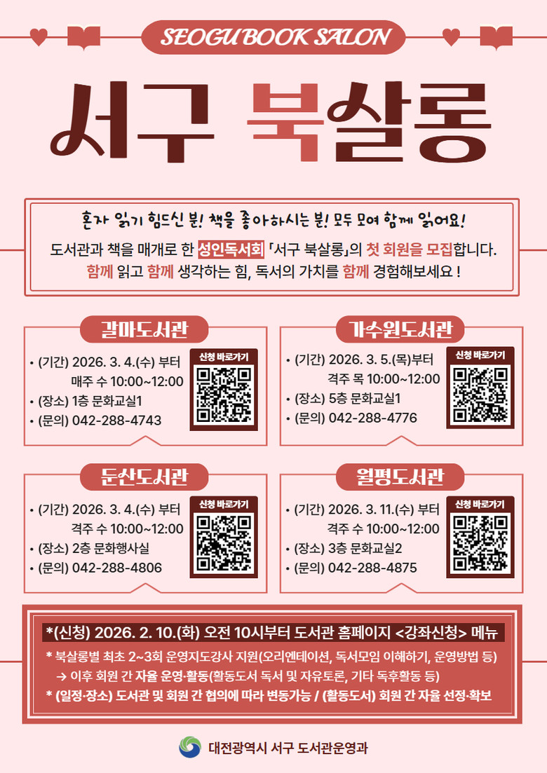 더 자세한 사항은 △갈마(☎042-288-4743) △가수원(☎042-288-4776) △둔산(☎042-288-4806) △월평도서관(☎042-288-4875)으로 문의하면 된다.