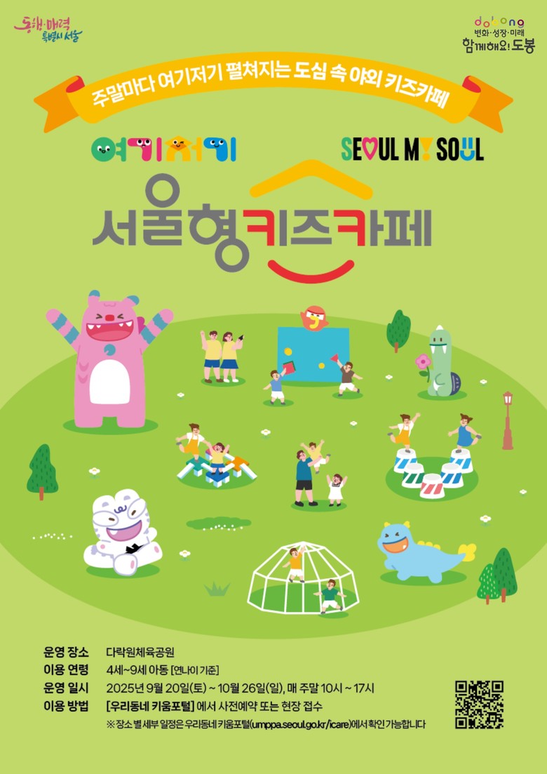 - 9월 20일~10월 26일 주말 오전 10시~오후 5시 [도봉구 세계타임즈=이장성 기자] 서울 도봉구(구청장 오언석)가 오는 9월 20일부터 10월 26일까지 주말마다 다락원체육공원에서 ‘여기저기 서울형 키즈카페’를 운영한다.