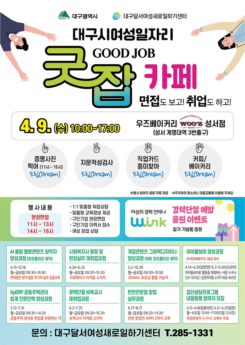 당일 현장방문이 어렵다면 달서여성새로일하기센터(☎285-1331)로 문의하면 경력, 연령, 희망직종 등을 고려한 맞춤형 직업상담과 취업 연계는 물론 취업 후 사후관리 서비스도 함께 받을 수 있다.