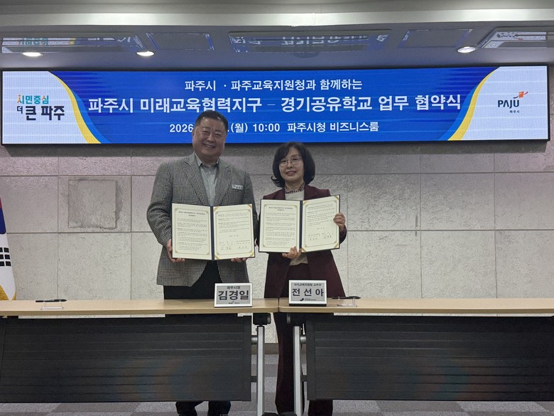 [파주시 세계타임즈=송민수 기자] 경기도파주교육지원청(교육장 전선아)은 2026년 2월 23일(월)에 파주시(시장 김경일)와 ‘파주시 미래교육협력지구–경기공유학교’ 업무협약을 체결했다.