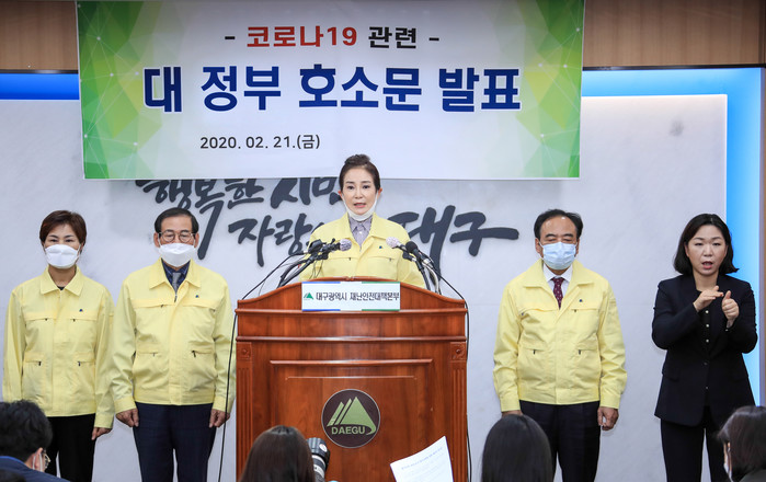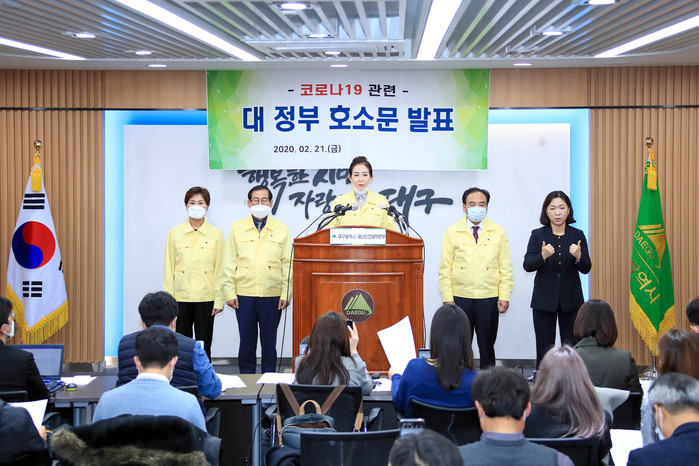 [대구=세계타임즈 한성국 기자] 대구광역시의회(의장 배지숙)는 2월 21일(금) 오후 4시 대구시청 2층 상황실에서 중앙정부의 적극적인 지원을 요청하는 ‘대구지역 코로나 19 위기극복을 위한 대정부 호소문’을 발표했다.