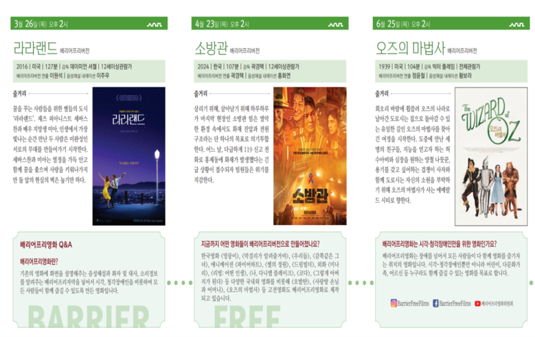 서울역사박물관 배리어프리영화관은 3월 <라라랜드>, 4월 <소방관>, 6월 <오즈의 마법사>, 7월 <괜찮아 괜찮아 괜찮아!> 등 사랑·희망·성장을 주제로 대중성과 작품성을 갖춘 영화를 선정하였으며, 모든 영화는 배리어프리 버전으로 제작되었다. 하반기 상영작은 추후 확정할 계획이다.