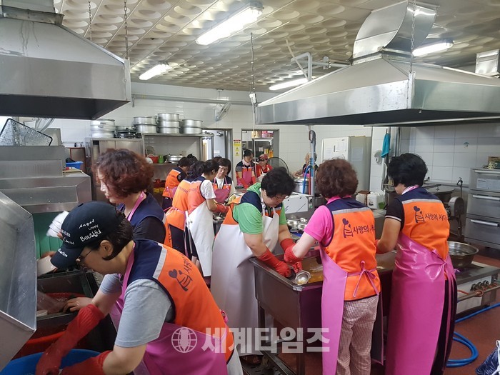 이날 설거지봉사에는 유희자 나눔봉사단장을 비롯해서 20명의 회원들이 더운 날씨에도 불구하고 주방 안에서 구슬땀을 흘려가면서 봉사를 함께 하였다.