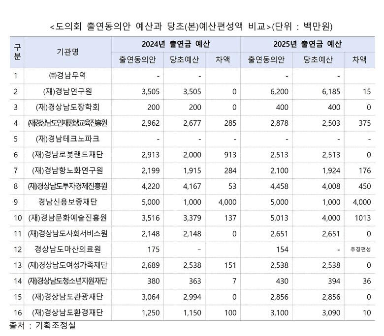 이 자료에 따르면 의결액과 예산편성액 차이는 2024년 61억 8,500만 원, 2025년에는 62억 2,900만 원에 달했다. 올해 경우 경남신용보증재단은 40억 원, (재)경남문화예술진흥원은 10억 원 적게 편성한 것으로 조사됐다.