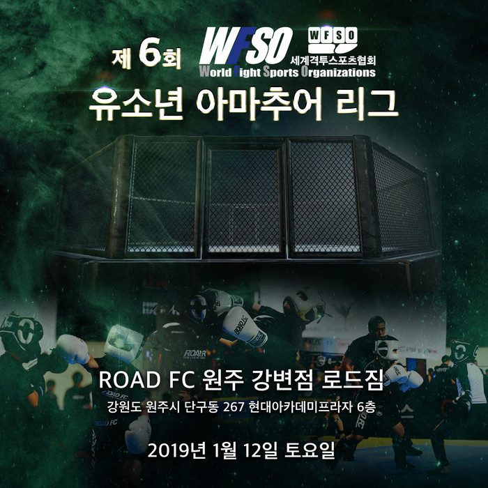 [세계타임즈 김인수기자] WFSO (세계격투스포츠협회)는 2019년 1월 12일 강원도 원주시에 위치한 로드짐 원주 강변점에서 제 6회 WFSO 유소년 리그를 개최한다.