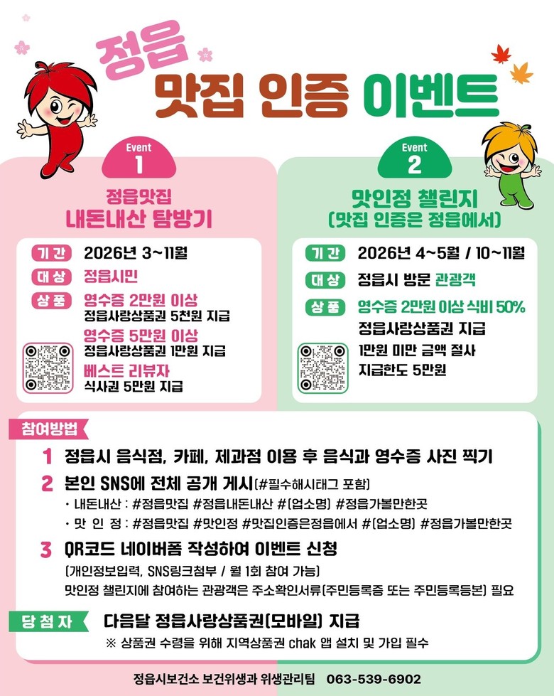 이벤트 참여를 원하는 시민은 관내 음식점이나 카페, 제과점을 이용한 뒤 촬영한 인증 사진과 해당 월에 결제한 영수증을 필수 해시태그와 함께 개인 SNS에 게시하면 된다. 이후 정읍시 공식 SNS 채널이나 누리집에 안내된 정보무늬(QR코드)를 통해 네이버 폼에 접속해 개인정보와 게시물 링크를 제출해 신청을 완료할 수 있다.
