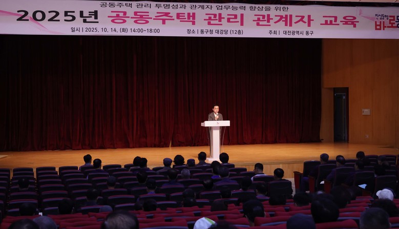 [동구 세계타임즈=이채봉 기자] 대전 동구(구청장 박희조)는 지난 14일 구청 대강당에서 관내 의무관리대상 공동주택 76개 단지의 관계자 370여 명이 참석한 가운데 ‘2025년 공동주택관리 관계자 교육’을 실시했다고 밝혔다.