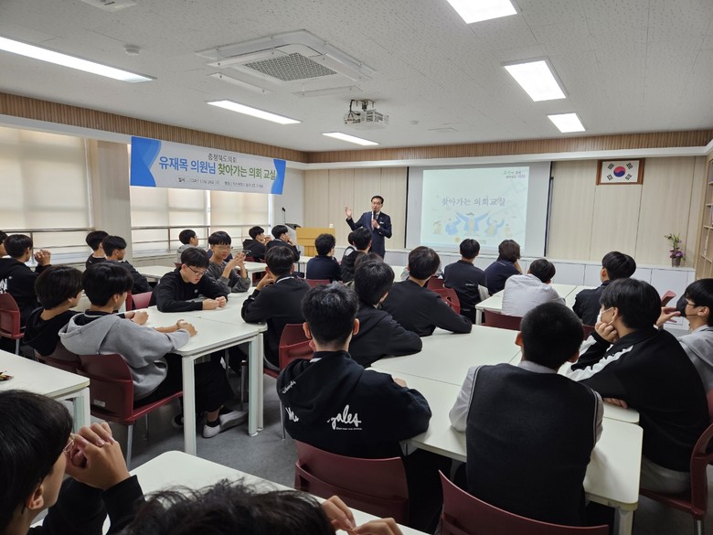 이날 의회교실에는 산업경제위원회 소속 유재목 의원(옥천1)이 옥천중학교(교장 황인문)를 방문해 학생자치회 학생 36명을 대상으로 조례 제·개정, 예·결산안 심의, 행정사무감사 등 도의회의 역할을 영상과 함께 소개했다.