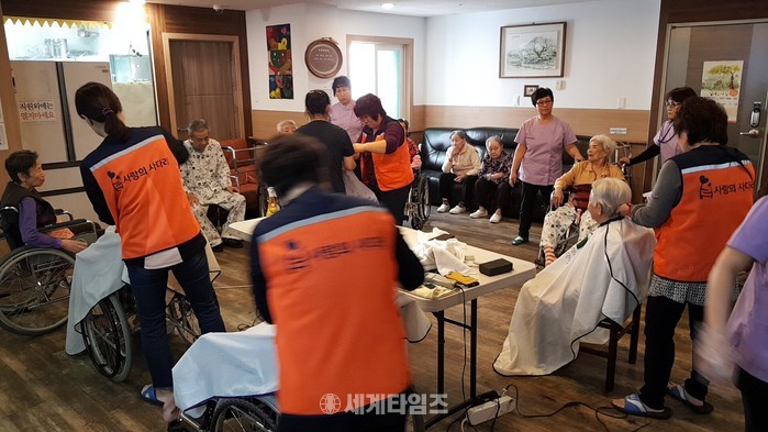 [대전=세계타임즈 이장성 기자] SNS에서 자발적으로 만들어진 5천명 봉사단체 사랑의 사다리 밴드(리더 이정제)가 8일 오전 10시∼오후1시 대전 대덕구 비래동에 위치한 예사랑실버케어 요양원(원장 김숙희)에서 치매 및 와상 어르신들 70분께 미용봉사로 사회적 효행을 실천하였다.