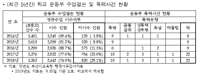 그러나 이러한 대책에도 불구하고, 부산지역 학교 운동부 폭력사건은 (‘14년)8건→(‘15년)9건→(‘16년)9건→(‘17년)22건→(‘18년)23건으로 최근 몇 년 사이 급증한 상황이다.