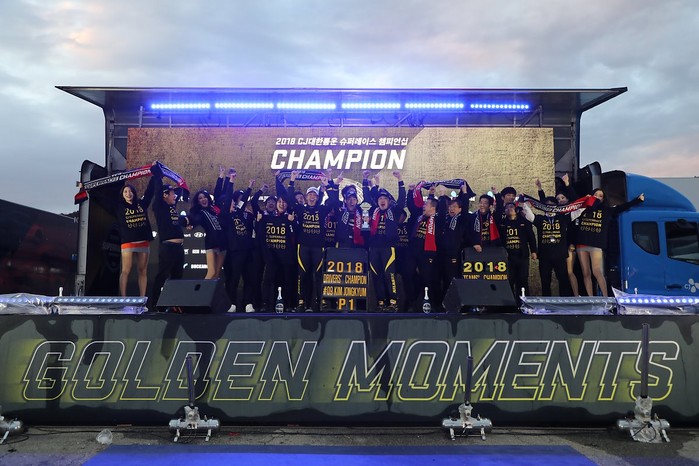 [사진설명] 2018 CJ대한통운 슈퍼레이스 챔피언십 팀 챔피언을 차지한 아트라스BX 레이싱의 선수 및 스태프들이 최종라운드를 마치고 진행된 시상식에서 환호하고 있다.