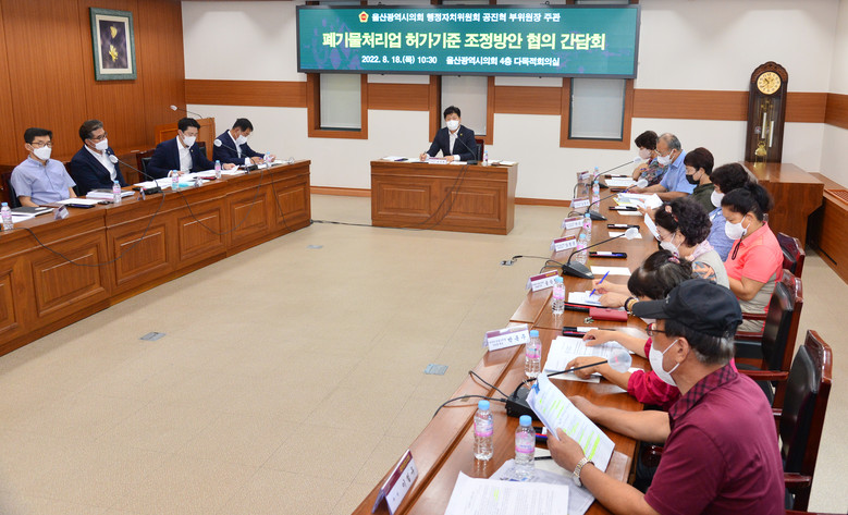 [울산 세계타임즈=이호근 기자] 울산광역시의회 공진혁 행정자치위원회 부위원장은 18일 오전 10시 30분, 시의회 4층 다목적회의실에서 ‘폐기물처리업 허가기준’에 관한 주민 의견 청취 간담회를 개최했다.